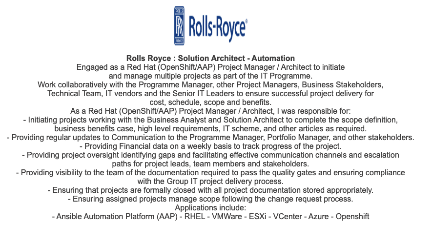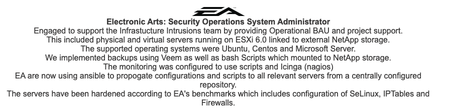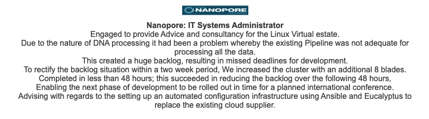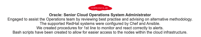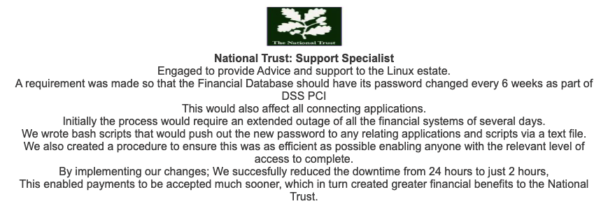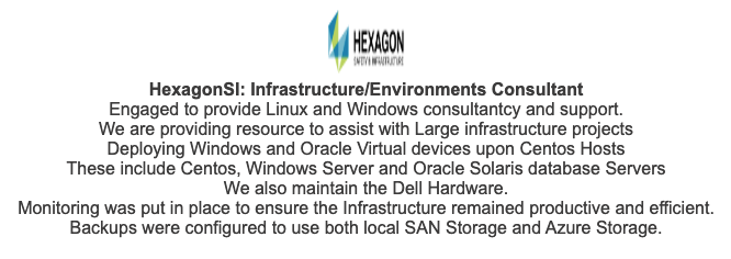 Ken was an onsite engineer for all things Linux/Unix Working on BAU and Project work and dealt with a range of things including incident fixes and working with front office (offshore team), assisting with technical enhancements, training, recruitment plans, process improvement and documentation. Ken got on with everyone in the team and built strong relationships with all of the stakeholders he was involved with. Ken is Very strong technically and on top of documentation and process which was essential in his role. He has a proactive approach and drives quality from himself and his team/s. He was always productive and there was never a time I felt I needed to monitor his output