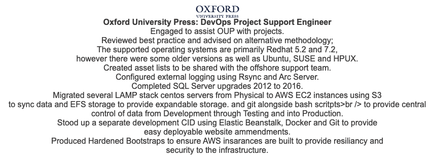 Ken is a Linux expert with a vast knowledge of DevOps and cloud tooling. Ken is excellent at automating repetitive tasks, scripting and configuration management. I have had the pleasure of working with Ken for the last 6 months as a part of OUP's journey to the cloud and would highly recommend him for any Linux, DevOps or cloud-related roles.