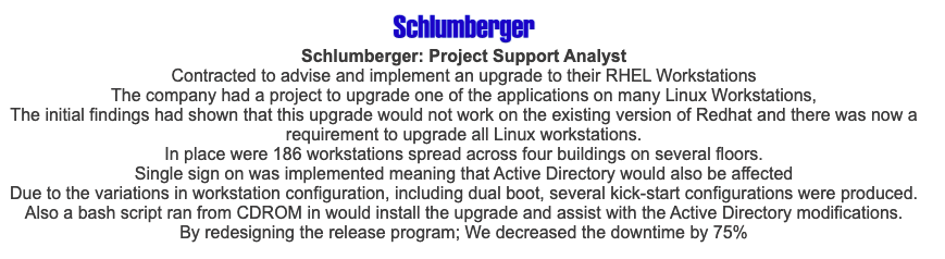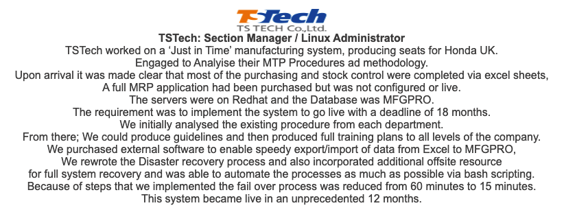 Ken has a good working knowledge of a variety of different systems, but RedHat is where his talent lies. During his time at TS Tech UK; Ken demonstrated a high level of skill and produced many scripts and procedures to make life easier for the rest of the department. Ken also took the time to write detailed documentation of the implementation of the QAD systems and the processes that each department in the business would use so that the IT department could resolve any issue with ease and without delay.